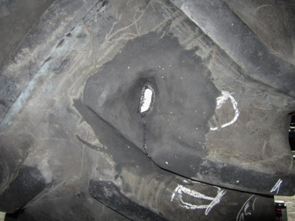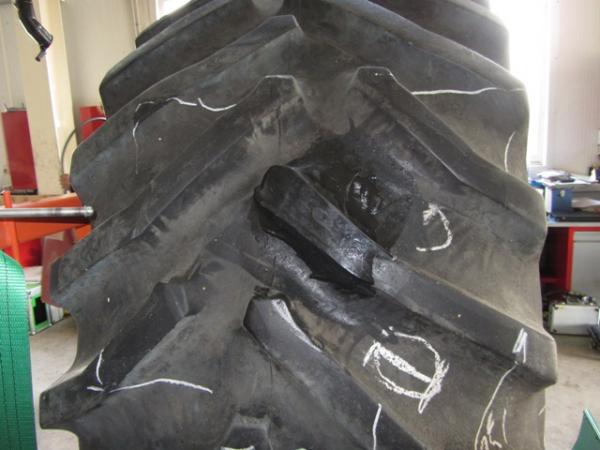 На форуме http://forum.tech-russia.ru/ уже писали, как восстановить протектор для легковых и грузовых шин с помощью машинки для нарезки протектора S146B. Рисунок протектора крупногабаритных шин (КГШ), как правило, состоит из шипов, расположенных на значительном расстоянии друг от друга, и восстановить поврежденный шип на протекторе КГШ с помощью данной машинки невозможно. На среднеизношенной крупногабаритной шине высота шипа составляет около 9 см. Для машинки-регрувера не существует суперлезвий такого размера, чтобы было возможно нарезать крупногабаритные шины. Поэтому протектор на КГШ восстанавливают следующим образом. Сначала обрабатываются повреждения пневмодрелью S1036 и абразивными полусферами так, чтобы они были в виде Y-образного углубления и без резких перепадов. Далее, согласно инструкции по ремонту шин, повреждение обрабатывается чистящей жидкостью арт. 704E, потом клеем для горячей вулканизации арт. 1082, обратите внимание, что можно использовать и клей для холодной вулканизации арт. 760. Не забывайте, время высыхания у этих клеев разное!