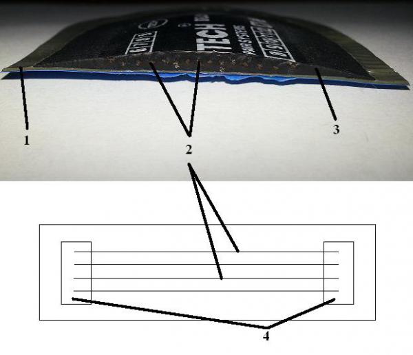 Основные элементы кордовой заплатки: 1. Адгезивный серый слой 2. Эластичные нити корда 3. Резиновый слой 4. Скобы http://forum.tech-russia.ru/picture....&pictureid=309 Адгезивный серый слой вступает в реакцию с клеем и резиной, благодаря чему осуществляется процесс холодной вулканизации. Корд обеспечивает прочность. Скобы фиксируют нити, чтобы они не расползались. Из устройства вытекает правило расположения кордовой заплатки. Направление нитей должно совпадать с направлением корда покрышки. Расположение скоб дает понять, почему нельзя резать заплатку на части. |