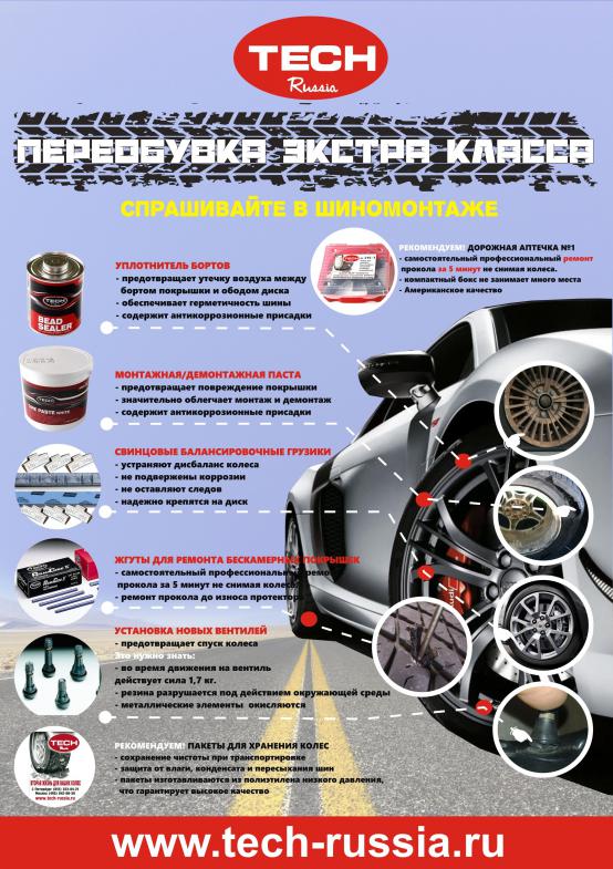 1) Обработка обода колесного диска уплотнителем бортов BEAD SEALER фирмы Tech, артикул 735, который обеспечивает герметичность шины и содержит антикоррозионные присадки. Уплотнитель бортов BEAD SEALER произведен в США и является самым эффективным и высококачественным средством для герметизации колес среди отечественных и зарубежных аналогов. 2) Замена старых вентилей, неизвестного производителя на новые качественные вентили, предлагаемые компанией TECH-RUSSIA. Многие шиномонтажные станции экономя, покупают и устанавливают дешевые вентили сомнительного качества, которые не выдерживают и нескольких месяцев эксплуатации. Резиновые части таких вентилей усыхают, покрываются трещинами, а металлические части быстро окисляются и ржавеют. Все это в итоге влияет на безопасность эксплуатации автомобиля. 3) Упаковка снятых с автомобиля колес в пакеты ТЕСН для упаковки шин артикул BAG22. Прочные пакеты ТЕСН имеют размеры 99 х 100 см и помогут сохранить шины от воздействий окружающей среды до следующего сезона переобувки. Для презентации дополнительных услуг с использованием материалов Tech Вам поможет наш плакат, который Вы можете получить в офисах продаж компании TECH-RUSSIA или скачать его электронную версию с сайта (http://www.tech-russia.ru/o_kompanii...kat_tech_2015/) и распечатать у себя на принтере. Последний раз редактировалось Кеда Виталий; 08.09.2015 в 10:17. |