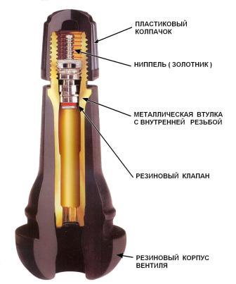 Резиновый вентиль состоит из резинового корпуса, внутри которого помещена металлическая втулка с внутренней резьбой для ввинчивания золотника и наружной резьбой для навинчивания пластикового (металлического) колпачка. Золотник имеет уплотнительную втулку, резиновый клапан и пружину, которые установлены на стержне. При накачивании воздуха клапан сжимает пружину и открывает воздуху проход в покрышку. После прекращения накачивания клапан под действием пружины и давления воздуха плотно прижимается к втулке и не позволяет воздуху выходить из покрышки.