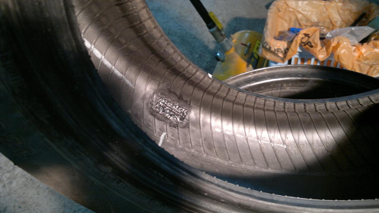 ща самое главное грамотно зачистить.надо аккуратно найти границу повреждения.находим уцелевшие нити корда по краям.потом копаем в глубину до полного раскапывания повреждения(ща было не глубоко).пользуем набор rh635.после обезжиривания мажем клеем горячей вулканизации 1082.